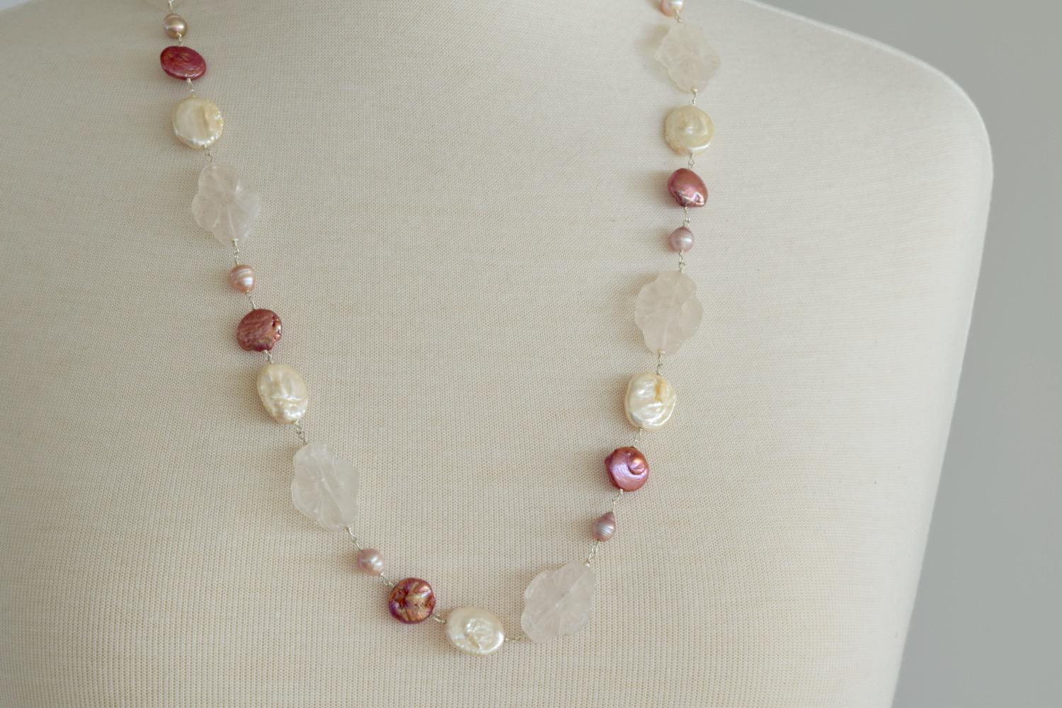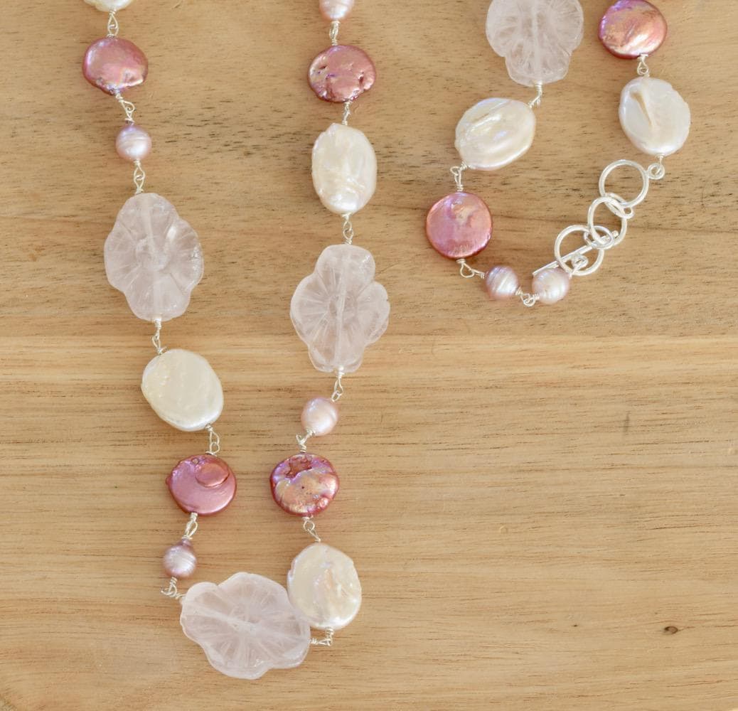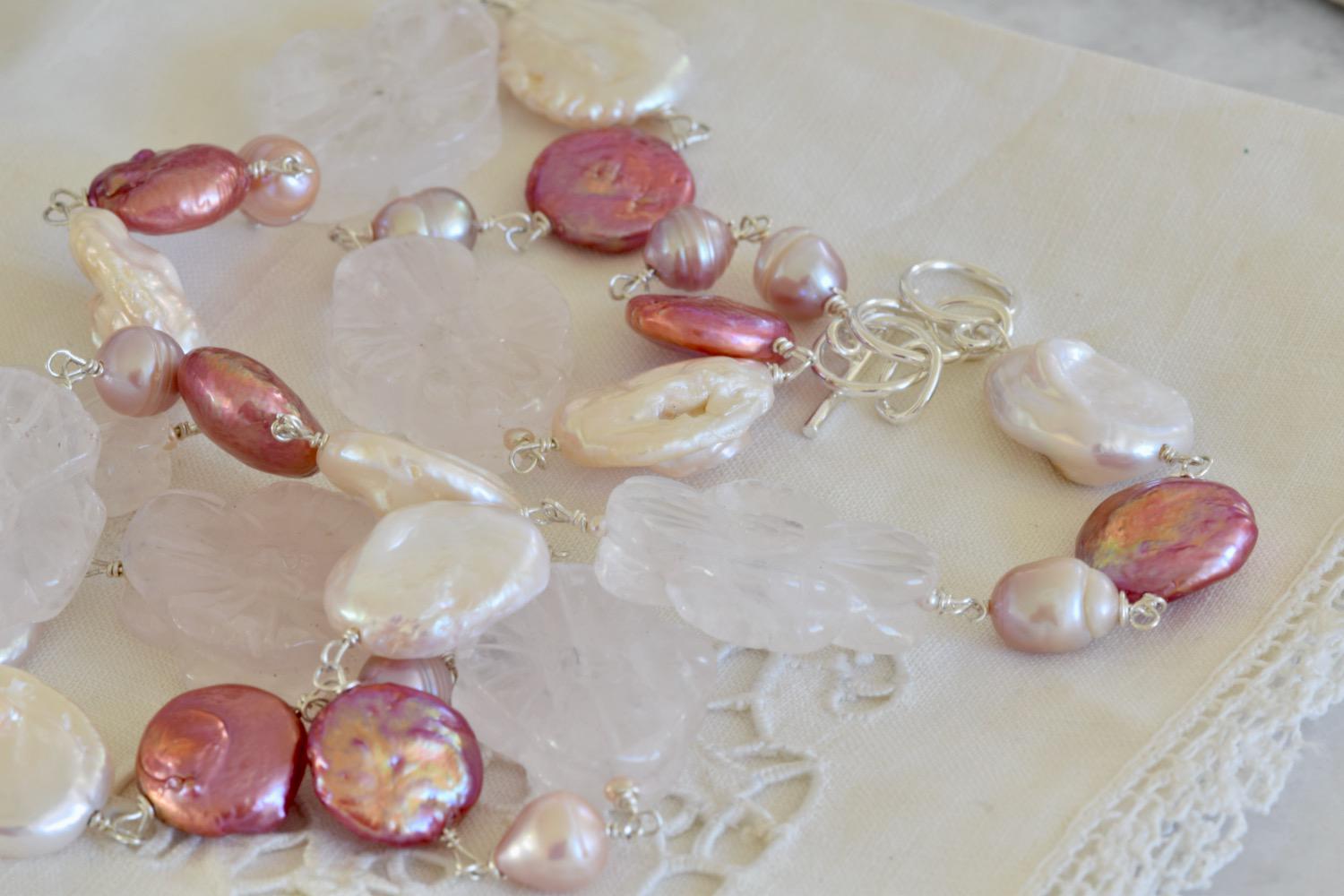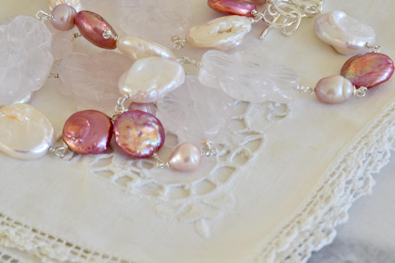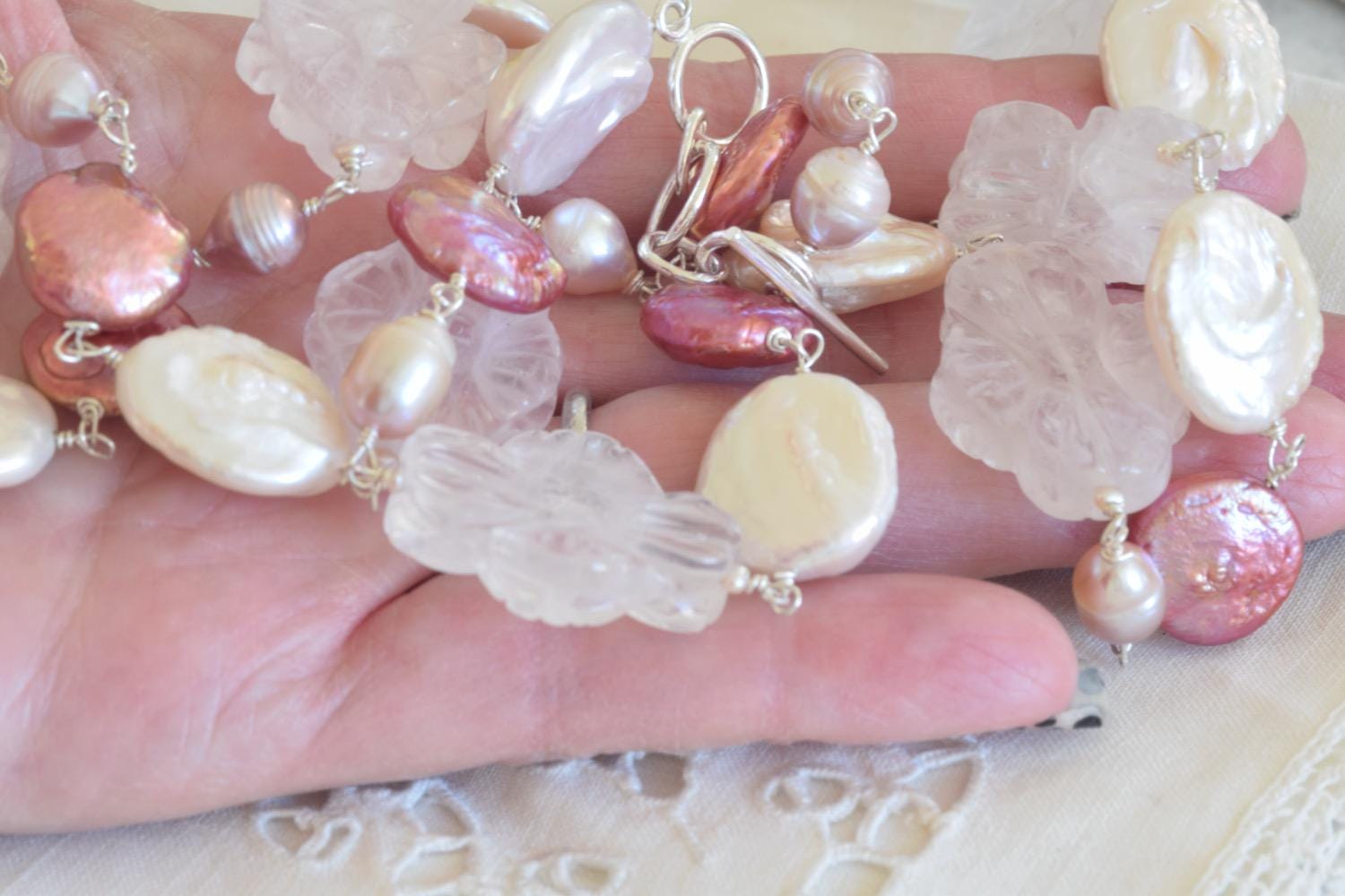 Carved flower Rose Quartz, rose colored coin pearls, Creamy white oval coin pearls and pink teardrop freshwater pearls. All wire wrapped with sterling silver wire.
