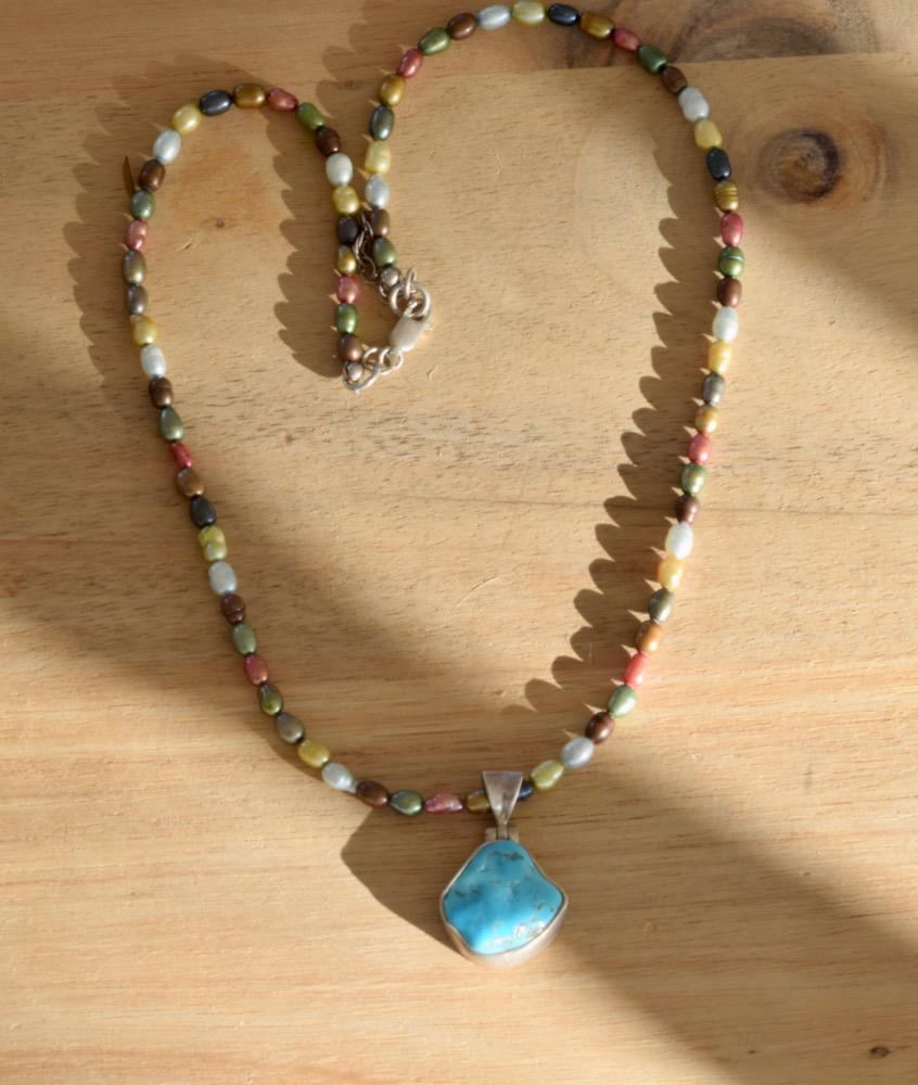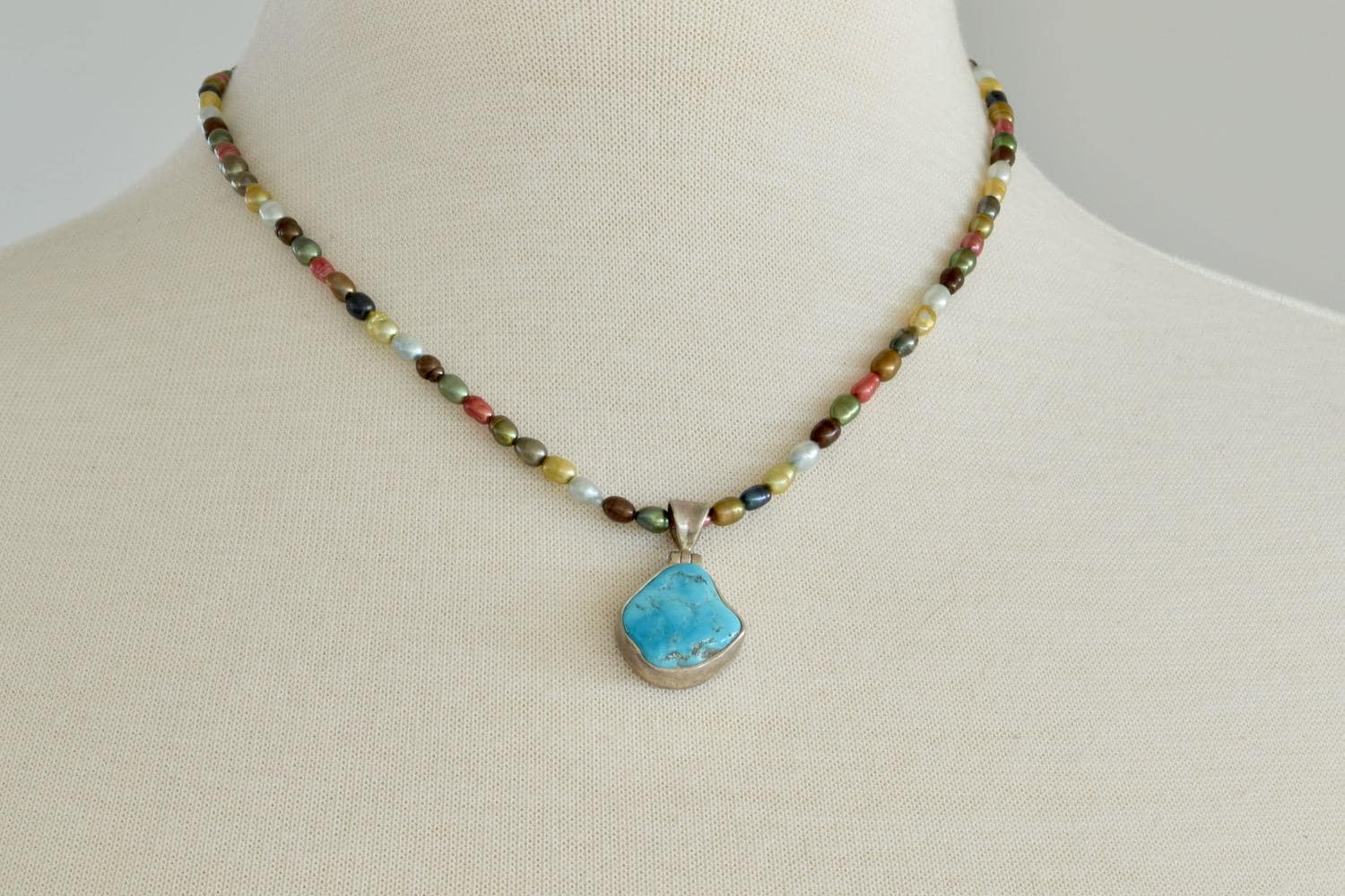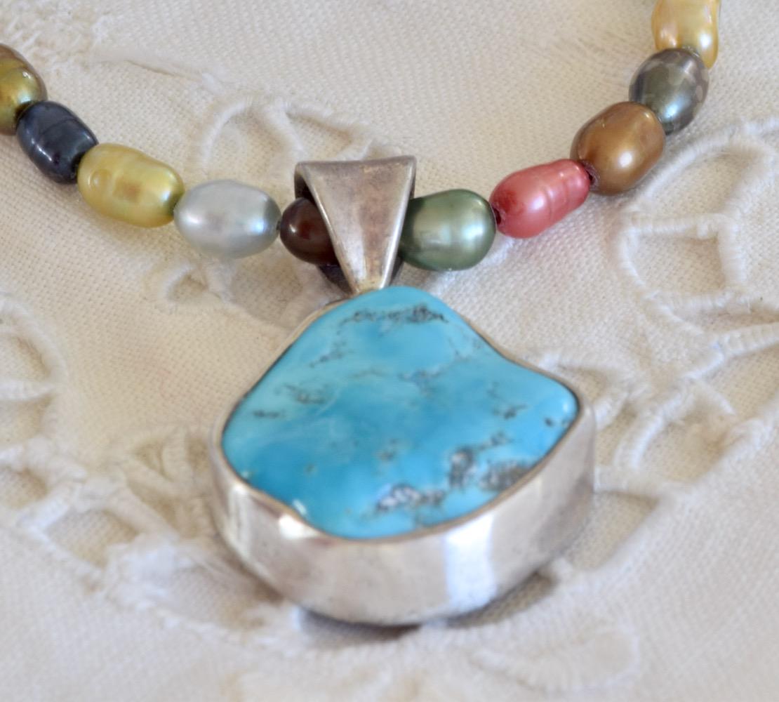 A beautiful chunky pendant of Sleeping Beauty Turquoise hangs on multi color fresh water pearl necklace.