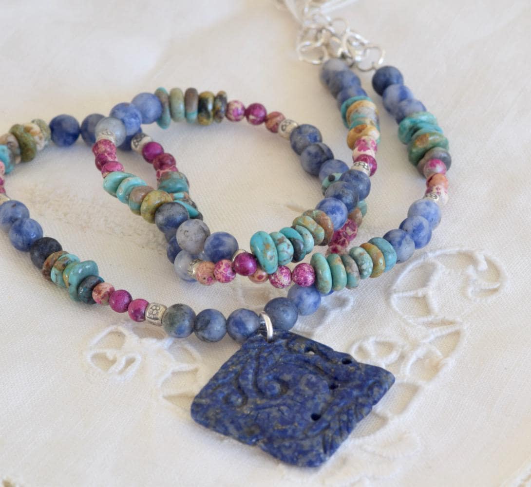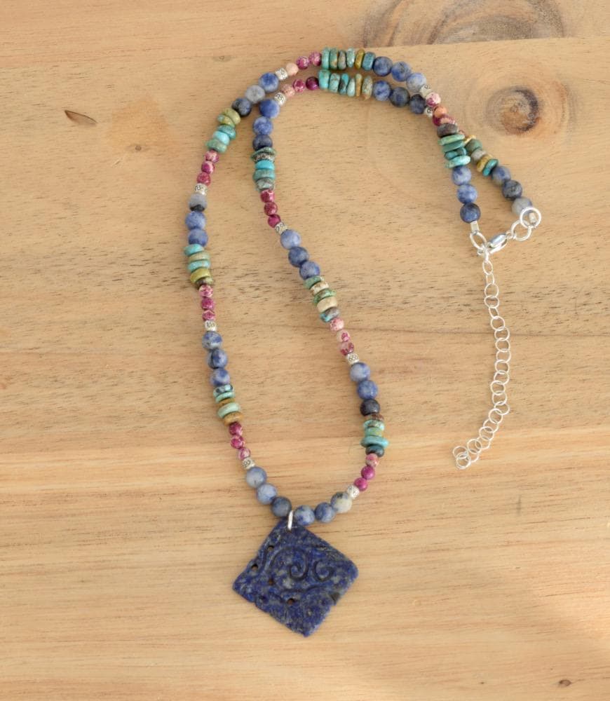 Necklace is made from sterling silver Hills tribe beads, sodalite, turquoise chips and pink agate.