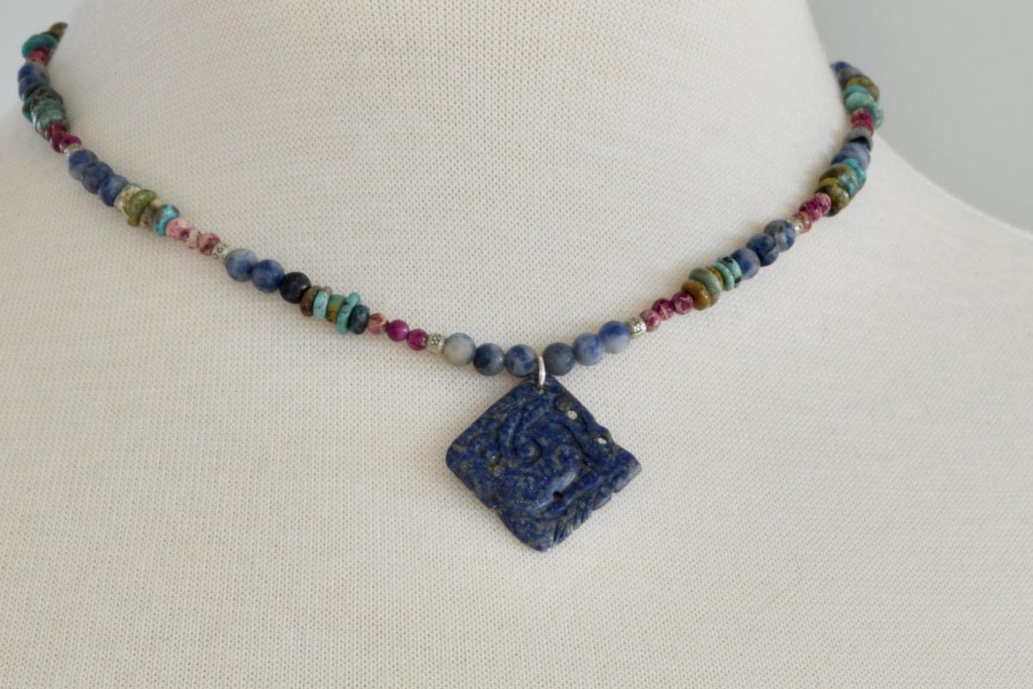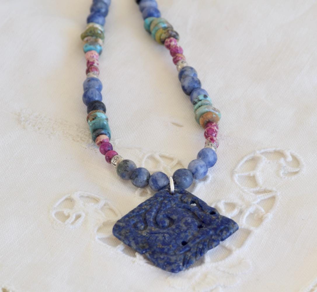 A unique double sided carved square of lapis 20mm x 20mm pendant.