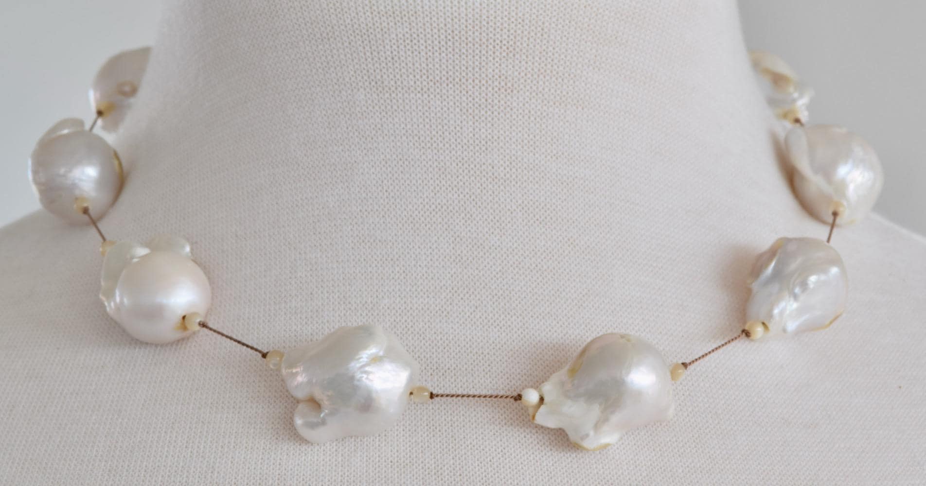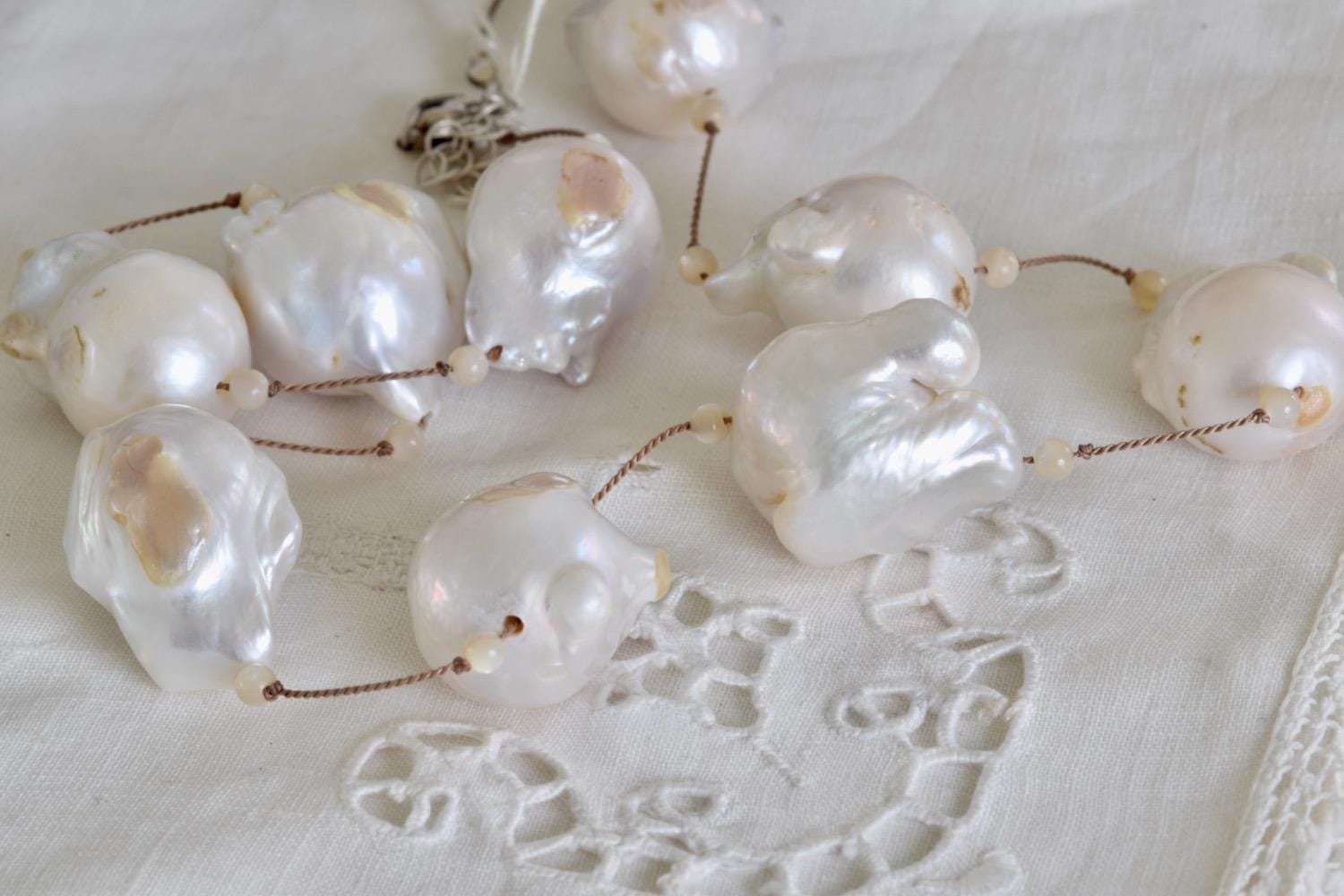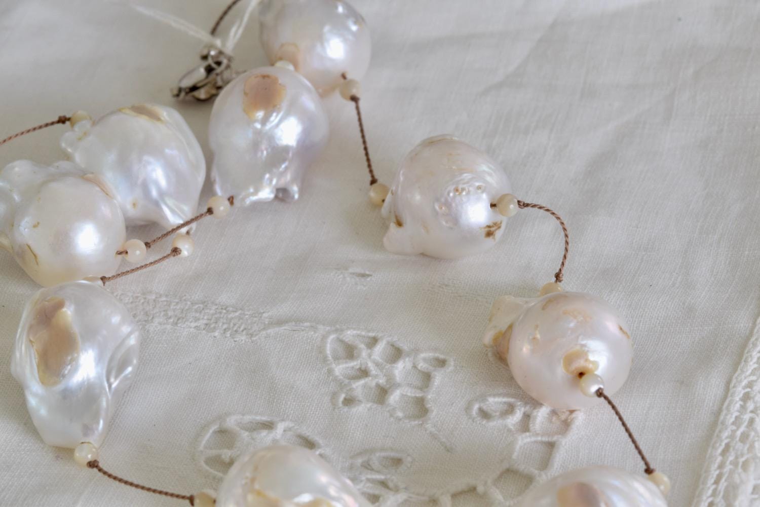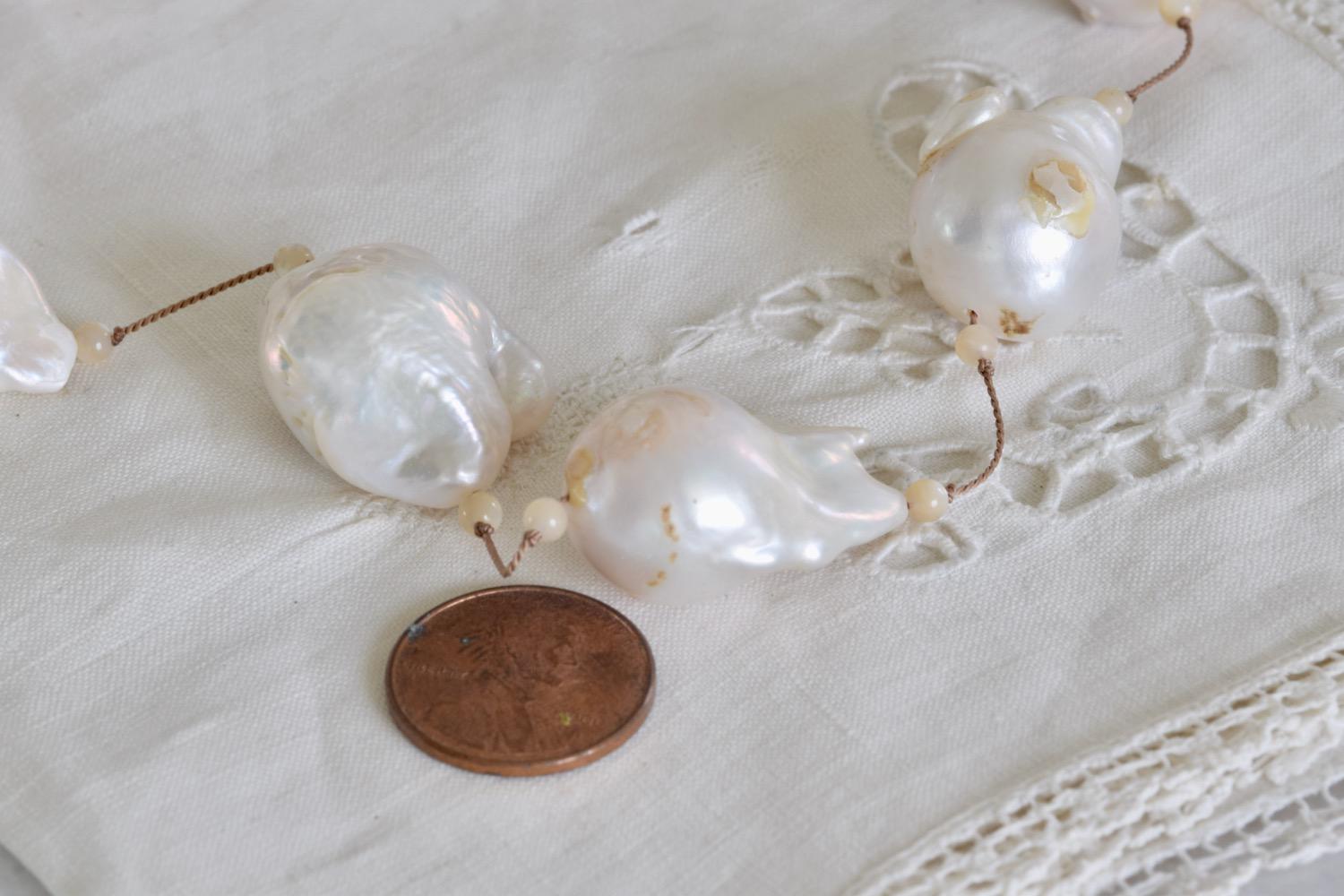 Stunning, Natural Baroque pearls on a hand knotted taupe cord. Small mother of pearl beads frame each pearl. All the pearls are a natural color, not dyed!
